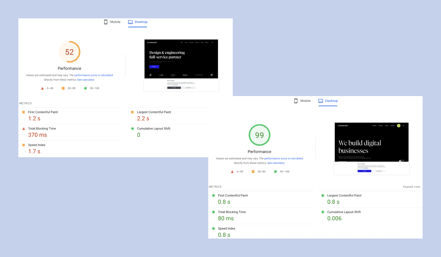 And the fact that the new website is not only beautiful, but also technologically tuned, is probably the best proof of the comparison of scores in Google Page Speed Insights (which is the industry standard for measuring web performance), where we jumped from values around 50 on the old Weblflow on the desktop web at an almost perfect 99 🎉. However, we are not done here, we are still fine-tuning the last details in order to reach the magical hundred.