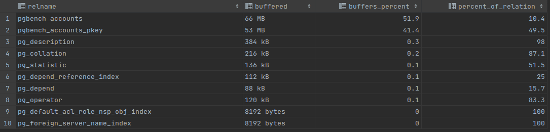 Na obrázku „a“ môžeme vidieť, že tabuľka accounts a tabuľka accounts_pkey celkovo zaberajú takmer celú veľkosť zdieľanej vyrovnávacej pamäte, 119 MB, čo je viac ako 92 % celej zdieľanej vyrovnávacej pamäte. V stĺpci percent_of_relation je možné vidieť, že je veľmi dôležité, aby server uchovával tabuľku accounts_pkey v pamäti, napriek tomu, že tabuľka s účtami je uložená vo vyrovnávacej pamäti na 10,4 %, táto je uložená na 49,5 %. Po zvýšení veľkosti zdieľanej vyrovnávacej pamäte na 256 MB je možné vo výsledku „b“ vidieť, že tabuľka accounts_pkey má vyrovnávaciu pamäť na 89,7 %.
