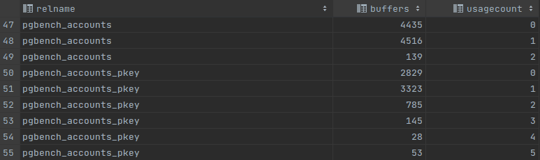 Usage counter môže povedať veľa o zdieľanej vyrovnávacej pamäti. Ak má väčšina vzťahov malý usage caounter, napríklad 0 alebo 1, pravdepodobne bude dobré zväčšiť veľkosť zdieľanej vyrovnávacej pamäte. Po zväčšení veľkosti zdieľanej vyrovnávacej pamäte môžeme na obrázku „b“ vidieť, že sa objavilo viac populárnych stránok a je lepšia rovnováha medzi nízkou a vysokou využívanosťou. Ak vidíme vysokú akumuláciu vyrovnávacích pamätí s počtom využitia, znamená to, že shared_buffer je celkom dobre optimalizovaný a ďalej sa zväčšuje, ak jeho veľkosť nepovedie k lepšiemu výkonu.